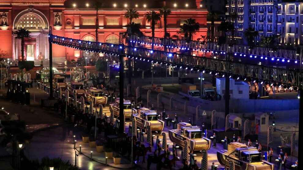 في قلب مدينة القاهرة وفي احتفالية كبرى من حيث البذخ والإنفاق جابت نحو 22 مومياء ملكية مصرية فرعونية، شوارع المدينة منطلقة من المتحف المصري العريق قرب ميدان التحرير الشهير، وصولا إلى المتحف القومي للحضارة المصرية في الفسطاط جنوب العاصمة، حيث ستستقر في انتظار افتتاح المتحف الحديث للزوار والسياح، في الثامن عشر من الشهر الجاري، بالتزامن مع يوم التراث العالمي. (أورينت)، هذه الاحتفالية التي تكلفت أموالاً طائلة تحملتها خزينة الدولة التي فتحت لهذا العمل بلا حساب وكأن هذا ما يحتاجه الفقراء أو أنه ما سيسد جوعة بطونهم ويكفيهم التفتيش في قمامة الأغنياء بحثا عما يشبع بطون أطفالهم!